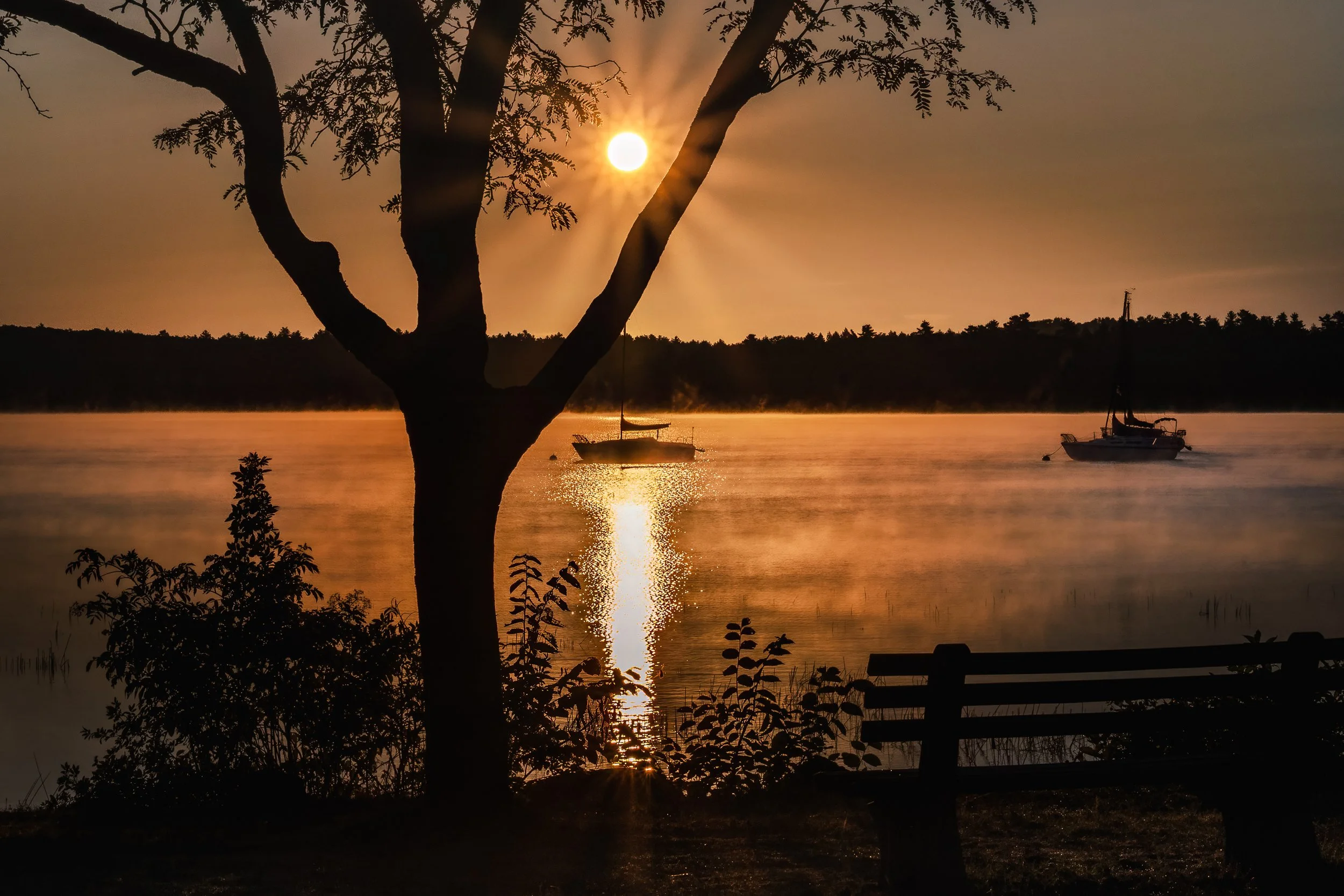 As the sun crests the horizon, soft mist drifts above the mirrored water of Massabesic Lake in Manchester, NH, the world awakens in a wash of coral and cobalt hues. A lone sailboat rests in still reflection — the perfect balance between motion and calm.